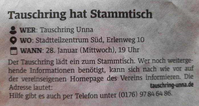 und der Stadtspiegel kündigen den dritten Stammtisch an. |